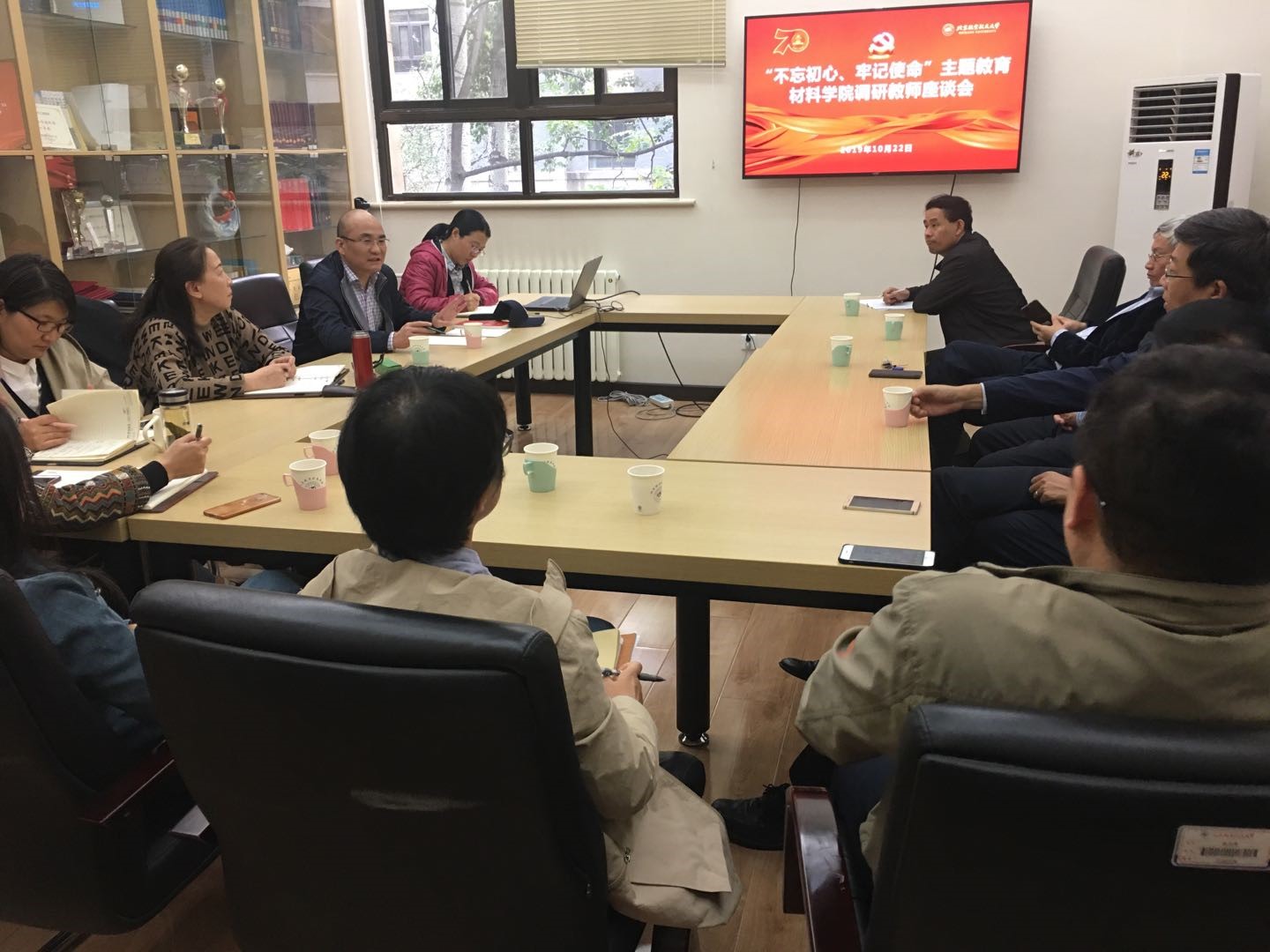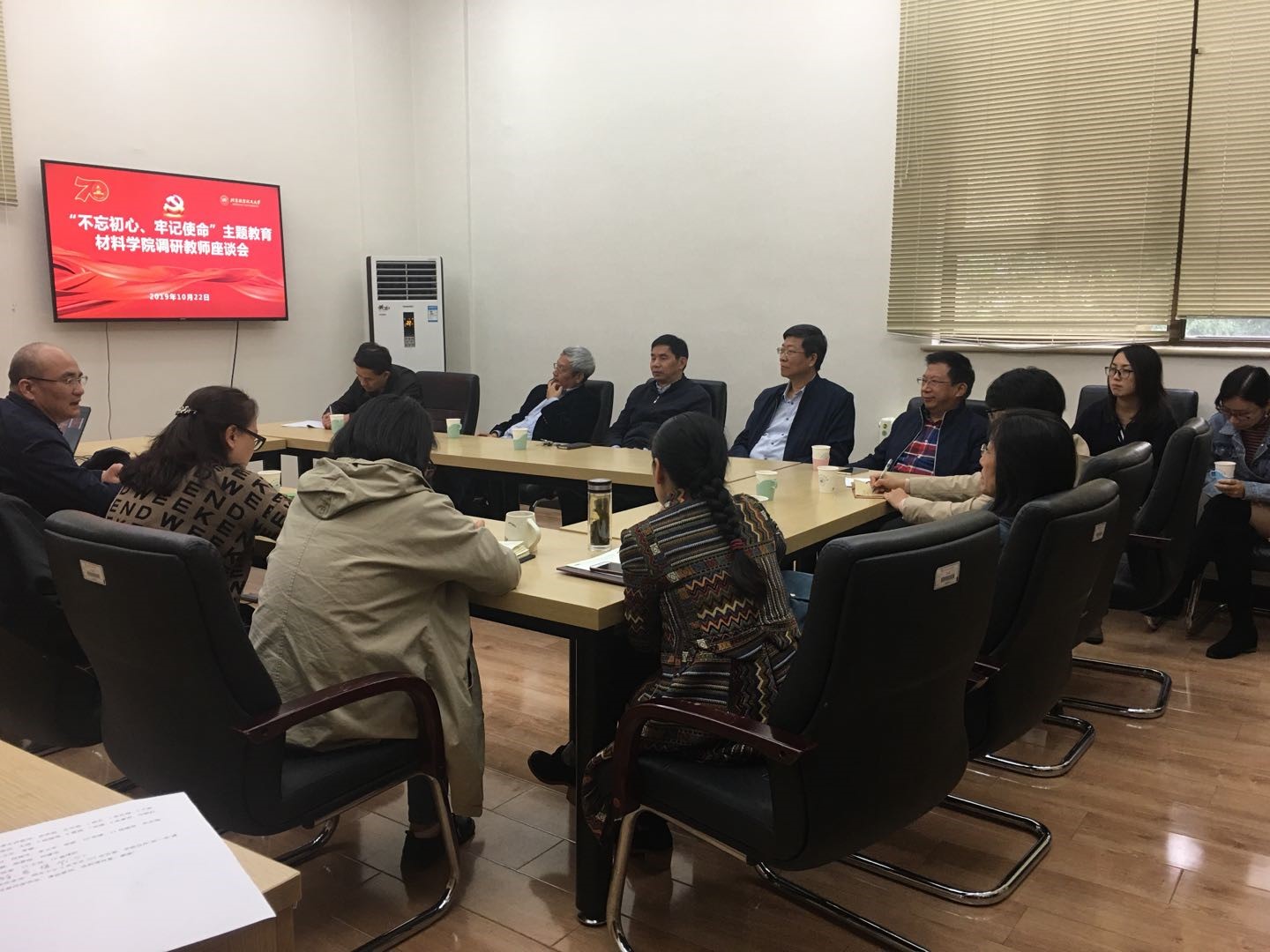 2019年10月22日,材料学院在4号楼201会议室召开了“不忘初心、牢记使命”主题教育学习调研教师座谈会。调研重点围绕习近平总书记全国教育大会精神、立德树人、扎实推进“双一流”建设及人才培养等议题,征求与会教师代表的意见和建议。蒋成保院长主持会议,本科教学副院长李松梅、研究生教学副院长邓元、刘建华、张跃、张峥、李卫平等教授和部分教师代表参加座谈会。