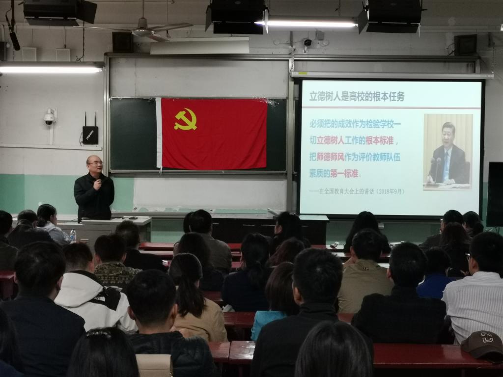 学院党委书记马朝利教授结合自己近期进行的“不忘初心、牢记使命”主题调研,介绍了自己对于教师队伍建设的认识和感悟。他首先明确了“立德树人”这一根本任务的重要意义和使命要求,介绍了了自己对于高校教师这一神圣岗位的认识和理解。之后马书记阐述了自己对于高校教师这一角色的两个基本判断,一是必须要坚持“热爱党、热爱社会主义、热爱教育事业”,二是必须要增强“四个意识”、坚定“四个自信”、做到“两个维护”。最后,马书记对在场的教师们提出了几点殷切期望,希望各位教师做到“四有好老师”、当好“四个引路人”、做到“四个相统一”。