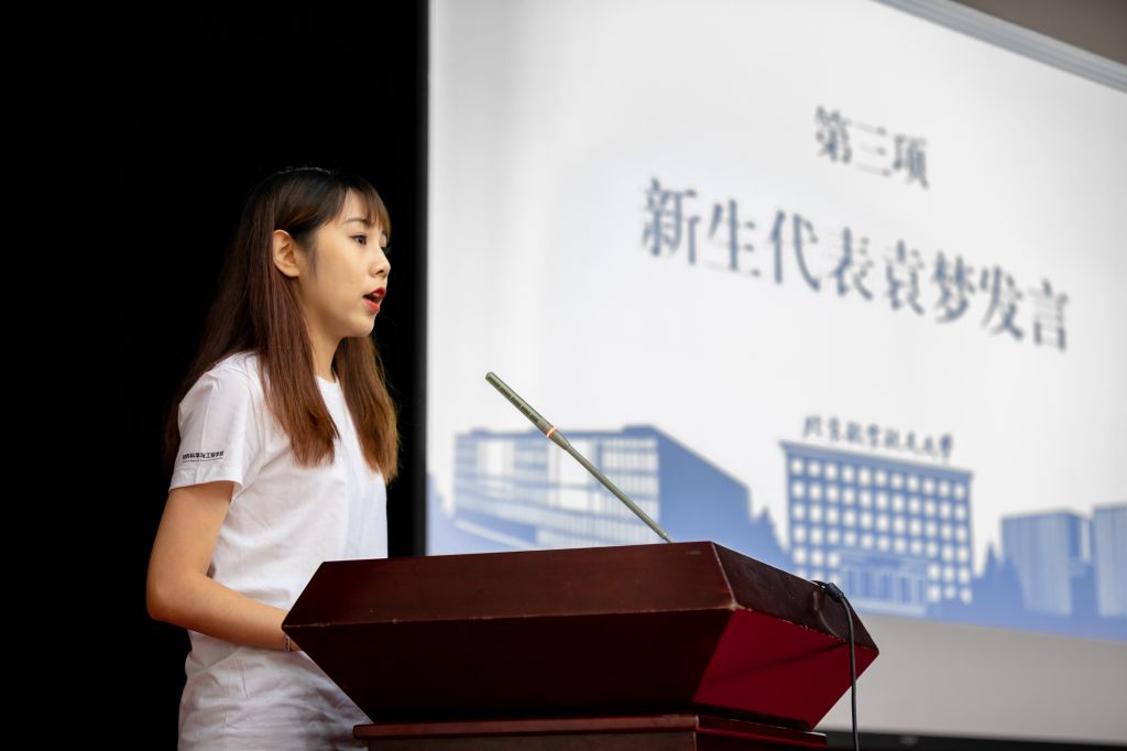 在学生发言环节,新生代表2021级硕士研究生袁梦讲述了自己圆梦北航的奋斗历程,描述了对于材料学院研究生学习生活的憧憬与向往,并以传承“空天报国,敢为人先”为目标为自己树立了坚实目标。
