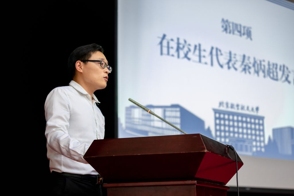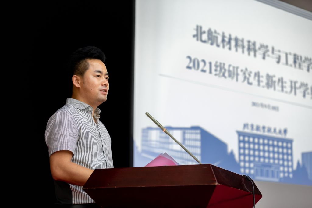 在校生代表2019级博士研究生秦炳超分享了自己在北航材料学院八年来的成长经历,并向在座的2021级全体研究生新生描述了科研成长中的思考,每一个日夜的奔赴与不懈让他从科研“小白”蜕变为Science第一作者,而面向国际学术前沿、瞄准国家重大战略需求终是材料学子永远的初心与使命。