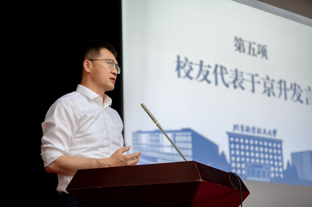 随后,材料学院95级校友代表于京升发言。于学长回顾了自己的大学生涯以及几十年来北航材料学院的变迁,并向在座新生提出了几点期盼与祝福,鼓励同学们树立远大理想,为祖国高精尖科技自立自强不断奋斗。